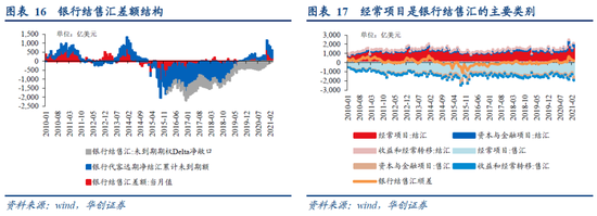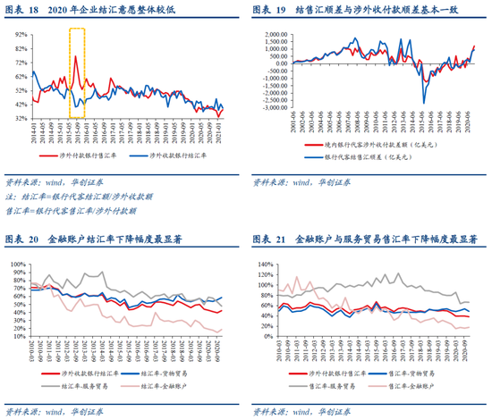 结售汇意愿下降虽然可能导致外汇的“漏损”,但这并非是导致2020年涉外收付款与外汇占款出现背离的原因。尽管2020年结售汇率普遍下降,但全年代客结售汇顺差/涉外收付款顺差的比值则达到123%,Q4该比值为105%,这意味着结售汇意愿并未影响到涉外收付款顺差向结售汇顺差的沉淀:2020年全年与四季度涉外收付款顺差分别为1169、795亿美元,而银行代客结售汇顺差分别为1442、838亿美元,二者规模接近,未出现背离。而这背后的主要原因在于结汇与售汇额同时下降,最终反而导致结售汇顺差额保持稳定,即2020年在银行收付款→银行结售汇的过程中并未出现外汇“漏损”的现象。