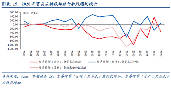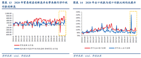 由于存在贸易顺差不顺收的现象,因此2020年屡创新高的贸易顺差并未带来银行代客收付款的余额也创新高。2020年前三季度我国出口收款与进口付款比例与过去2年基本持平,而Q4出现了出口收款率下降、进口付款率上涨的现象:2018-2019年出口收款率与进口付款率均值在97%、108%左右,而2020Q4分别达到89%、113%;因此加剧了出口顺差不顺收的现象(2020Q4贸易顺差2117亿美元,而涉外收付款顺差仅512亿美元)。而这可能与疫情期间企业对外贸易收付款延迟有关。通过BOP贸易信贷数据也可以得到验证:2020年我国贸易应收款、应付款均提升。不过外贸收付款的延迟可能会结转至后续月份,因此有望看到2021年一季度出口收款率提升。