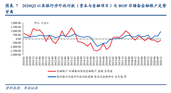 特别值得注意的是,由于银行涉外收付款未统计银行自身涉外交易,因此银行涉外收付款(资本与金融项目)与BOP非储备金融账户之间存在较大差异,而这一差异或可间接反映出银行自身涉外交易的规模和方向。例如2020Q4银行涉外收付款顺差932亿美元,而BOP非储备金融账户则呈现逆差173亿美元,二者存在方向性的差异,或反映了2020Q4银行存在大量的对外投资,带来较大规模的资本流出。(这一点通过下文3.2.2节中商业银行资产负债表等数据也可得以验证)
