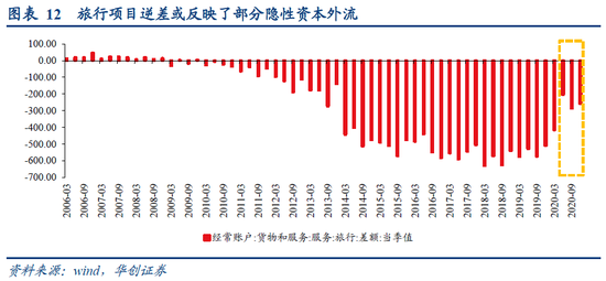 5、以经常账户形式存在的隐性资本外逃,例如服务贸易中的旅行分项,2020年我国跨境游基本全面暂停,理论上旅行分项的资本流出应该降至0附近,但2020年Q2-Q4每个季度仍有200-280亿美元的资金流出,可能即反映了以旅游名义的隐形资本外逃。