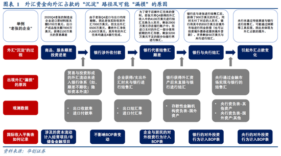 1、外汇“漏损”潜在原因③。通过银行结售汇的资金将进入商业银行资产负债表,此后的去向主要有四个:1)与央行结汇进入央行表里,形成央行资产负债表下的“国外资产:外汇占款”;2)留在自己表里,用途包括对外投资、对外放贷等,形成商业银行资产负债表下的“国外资产”;3)以非结汇形式将外汇缴纳给央行,形成央行资产负债表下的“国外资产:其他”;4)可能配合央行做掉期及衍生品操作来达到稳定市场预期或稳定外汇储备的特殊目的,进入央行资产负债表的“其他资产”科目。因此,当存款类金融机构增加国外资产的规模,或银行增加外汇准备金缴纳、央行采用掉期操作等行为是,会导致对央行外汇占款的挤出。