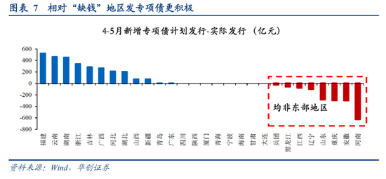 首先,今年地方财政边际上并不“缺钱”。1-4月广义财政收支预算差额自2018年后首次回正,广义财政收支增速差位于近年最高水平,反映财政收支平衡边际大幅改善;4-5月实际发行大于计划发行的均非东部地区,显示相对“缺钱”的地区发行更积极,反过来可验证“不缺钱”的地区发行意愿或相对不足。