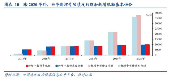 其次,项目质量不足越发成为专项债发行进度的关键制约。近年来专项债申报项目质量参差不齐,使专项债资金到账后项目使用进度较慢,如广东、四川等省级审计部门披露的2019年审计报告中显示大量地方政府债券资金“趴在账上”、浪费举债利息。2020年疫情冲击下,空前困难的地方财政竞相争夺专项债资金,使得项目质量问题和“钱等项目”现象暴露更为充分,引发财政部高度重视,并于7月底出台《关于加快地方政府专项债券发行使用有关工作的通知》(财预〔2020〕94 号),“赋予地方一定的自主权,对因准备不足短期内难以建设实施的项目,允许省级政府及时按程序调整用途”;随后8-9月新增专项债合计发行近1.1万亿,至10月基本发完了前4批3.55万亿新增限额,可见项目质量是专项债发行进度的关键制约之一。5月6日财政部部长刘昆在《经济日报》撰文指出“合理把握债券发行节奏,推动各地做好项目储备,优先选择成熟度高的项目予以支持”,表明项目质量是现阶段财政部把握债券发行节奏的重要考量。