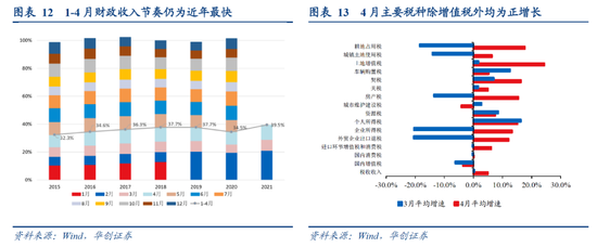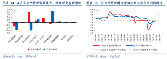 主要税种方面,除增值税(高基数)外均为正增长,企业所得税拉动贡献最大:4月企业所得税两年平均增长13.3%,明显好于3月的-20.4%和一季度的0.9%,拉动税收收入两年平均增速4个百分点,部分获益于大宗商品价格上涨带动工业企业利润较快增长、按季预缴的企业所得税在4月份入库增加;个人所得税持续高增,两年平均增长15.2%,3月为16.3%,一季度为11%,拉动税收收入两年平均增速0.7个百分点,除居民收入增长带动外,还与股权等财产转让收入和股息红利收入增长有关;增值税两年平均增长-3.6%,3月为-6.2%,一季度为-2.7%,拖累税收收入两年平均增速1.4个百分点,部分受到2019年4月减税预期影响下,部分下游企业主动要求上游企业在3月集中开票,而增值税缴税时间较实际开票时间晚,使得4月入库增值税收入较多的高基数干扰。