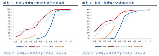 新增专项债的不及预期,还体现在新增限额进度完成明显偏慢。两会确定的2021年新增专项债限额为3.65万亿,而1-5月发行或不到5000亿,仅完成了约14%的全年新增限额,明显低于序时进度和2019、2020年同期进度(40%、57%),和今年新增一般债的进度(约42%)比也明显偏慢。意味着下半年新增专项债发行将相对集中(类似2018年),甚至已让市场担心今年3.65万亿专项债新增限额可能“发不完”。