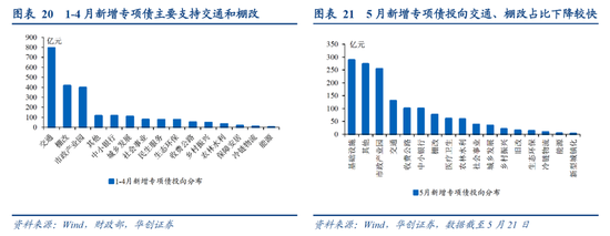 5月新增专项债发行不及预期,Q2广义财政支出回升力度存疑。从投向变化看,5月新增专项债投向交通、棚改占比下降较快:1-4月新增专项债中,投向占比较高的是交通(34.1%)、棚改(17.9%)、市政产业园(17.1%),截至5月21日,5月新增专项债主要投向基础设施(19.5%)、市政产业园(17.2%),交通、棚改占比分别下降为8.8%,5.2%。