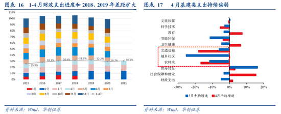 支出端,1-4月支出进度落后2018、2019年略有扩大,反映4月支出仍未明显转强。基建支出延续一季度弱基调,财政支出持续向社保就业、教育等民生领域倾斜。