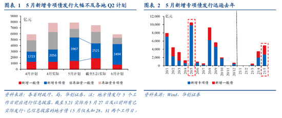 新增专项债实际发行情况如何?5月“高峰不高”,料将明显不及预期:截至5月21日,已知5月27日及以前所有已实际发行+已信息披露新增专项债仅为2521亿元(地方债发行5个工作日前应进行信息披露,因此5月21日已知5月27日发行)。在5月仅未知28、31两个工作日的情况下,按日度发行节奏预计5月新增专项债发行仅约2800亿,较计划发行规模合计的3967亿低近30%(1200亿),不论是和4月新增专项债发行的超计划(计划1723亿、实际2056亿)、还是市场此前的Q2发行高峰判断相比,都较大幅低于预期。