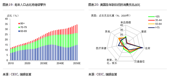 4. 随着中国的进一步发展和人口老龄化,消费可能继续从商品转向服务,尤其是医疗、保险和养老。根据联合国人口司的预测,到2030年中国60岁及以上人口将升至3.64亿(占总人口的24.8%),70岁及以上人口将达到1.58亿(图表19)。人口老龄化会导致消费模式发生结构化转变,相关研究表明老年人交通、通信和教育支出低于年轻人,而医疗服务、公用事业和其他服务支出更多(参见IMF报告)。美国数据显示各年龄阶段的消费模式存在明显差别(图表20),而中国自身的数据也显示,过去20年居民在医疗、交通、通信和住房上的支出上升,而在食品饮料和服装支出有所下降。