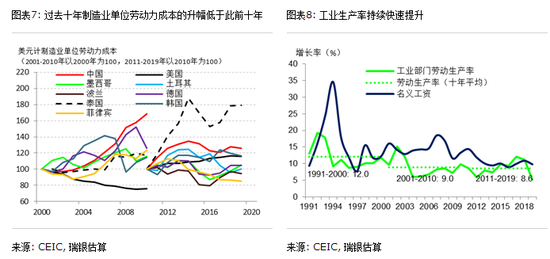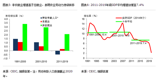 过去十年劳动年龄人口(15-59岁)数量减少4000多万人,但总就业实现了年均0.2%正增长,这可能表明实际(非官方)劳动参与率上升、实际失业率下降。更重要的是,2010年至2019年非农就业人数年均增长2.1%,虽然增速低于前二十年,但表现依旧亮眼(图表5)。这也印证了我们的观点,即劳动力向非农部门的转移仍在继续,总人口或劳动年龄人口并是预测就业增长或劳动力成本最有效的指标。