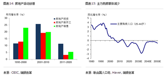 2011-20年间房地产销售、新开工和投资增速较此前十年均有所放缓,但都实现了正增长(图表14)。房地产活动放缓主要是因为主力购房年龄人口数量减少、以及城镇化进程放缓(图表15)。另一方面,平均家庭户人口从2010年的3.1人进一步降至2020年的2.62人,城镇家庭户规模则更低。家庭户规模缩小这一项就使过去十年家庭户数量增加了7700万户,远超过了人口增长带来的家庭户增长(2300万户)。再加上近些年落户政策政策放松,这可能也都支撑了房地产市场。