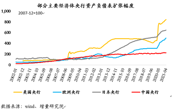 我们可以看到,2008年金融危机以来,欧美日央行均试图通过这三种方式来刺激经济。2008年1月至2021年4月,美、欧、日三个经济体央行资产负债表分布扩张846.06%、500.78%、647.20%。按照很多专家的逻辑,印钞机制会导致通货膨胀的上升,甚至会导致恶性通货膨胀。然而,美欧日不但未出现恶性通货膨胀,反而长期连经济复苏所必须的温和通胀都没有出现。