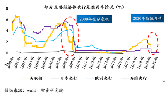 首先,降息的方法是目前各国央行所采用的相对比较传统的货币政策。在2008年及金融危机发生后,各大央行迅速将利率降至零附近。美联储基准利率最低降至0.05%,欧洲央行基准利率最低降至1%。在2008年金融危机期间欧洲央行稍显克制,但在随后的2012年欧债危机中,最终也将基准利率降至零。伴随着经济的逐步修复,过去数年,美联储一度进入加息周期,但随着新冠疫情暴发,国内经济走势日趋低迷,美联储再次迅速将利率降至0.1%以下。