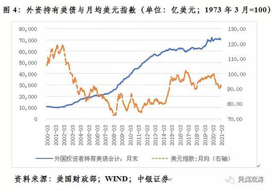 对外资持有美债规模和月平均洲际(ICE)美元指数取消自然对数后进行相关性分析结果显示,2000年3月至2021年3月间,二者为低度负相关0.365,即从较长时间看,外资净增持美债,美指走低。但分阶段看,情形又不太一样。如2014年1月至12月,二者为高度正相关0.795,即外资增持美债,美指走高;2015年7月至2017年12月间,二者为高度负相关0.801;2020年3月至2021年3月间,二者也为高度负相关0.815(见图4)。