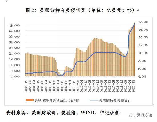去年3月以来至今,美国政府已出台了六轮财政刺激法案,总规模达5.68万亿美元(见表1)。美国联邦政府赤字率飙升,去年达到15.0%,较上年跳升了10.4个百分点。为弥补巨额财政赤字,美国国债发行大幅膨胀,去年4月至今年3月份美债余额净增4.45万亿美元,增长19%。祭出“零利率+无限量宽”王炸的美联储成为美债购买的主力。同期,美联储净增持美债1.96万亿美元,占到美债增加额的44%,远超过外资净增持美债7890亿美元的规模。到今年3月末,美联储持有美债占比达17.6%,同比上升了5.0个百分点,与外资持有美债占比下降4个多百分点的幅度大体相当(见图2)。
