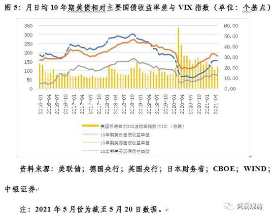今年2、3月份,则是美债收益率上行,美债相对主要国债正向收益率差扩大,推动美指止跌反弹。3月份,日均10年期美债相对德国和英国国债的正向收益率差,分别较去年12月份扩大41和15个基点。4月份以来的美指冲高回落,又与美债收益率回调,美债相对主要国债正向收益率差收敛有关。5月初至5月20日,日均10年期美债相对德国和英国国债的正向收益率差,分别较3月份减少13和5个基点(见图5)。