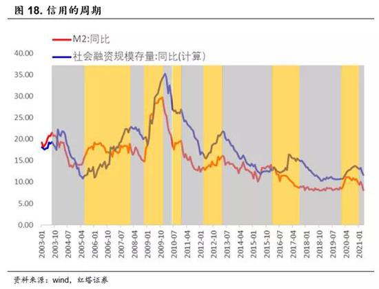 在获得社融数据后,我们结合M2同比增速以及社融存量同比增速来划分信用周期。需要注意的是,在2012年之后,我们会更注重社融的走势。