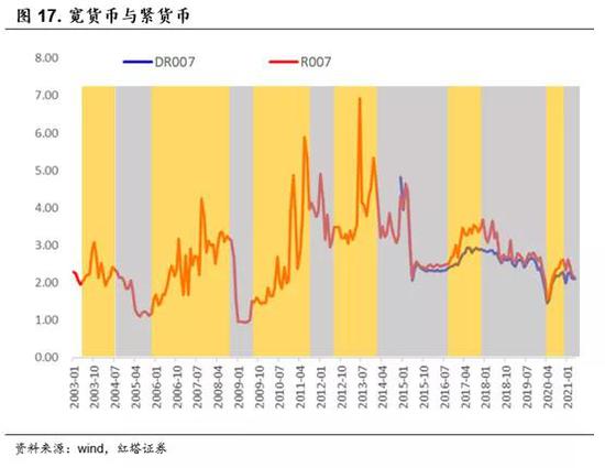 按照不同的标准进行划分,我们得出的“宽货币”和“紧货币”区间也会有些许的不同。不过因为核心意义是一样的,我们关注的都是狭义流动性的松紧情况,所以个别细微的偏差影响不大。