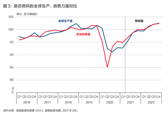如果观察疫情之后的形势则可以看到:2020年中期至2021年一季度,液态燃料(包括石油在内)的全球消费量持续大于全球生产量。这一需求缺口导致能源价格总体维持上涨。而且根据预测值,需求缺口还将持续存在一段时间,直至在下半年收窄并基本消失。