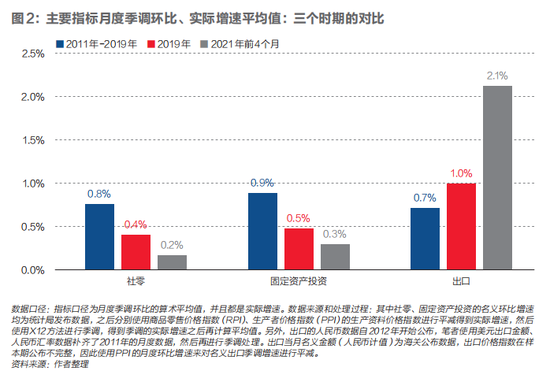 因此,从季调环比增速的平均值角度来看,2021年前四个月的内需表现明显弱于疫情之前的常态,而出口部门的表现则相反。