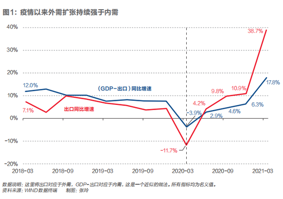 但是疫情冲击之后,外需经历短暂下行之后出现了强烈反弹。2020年二季度到2021年一季度,外需增速、内需增速差值越来越大。