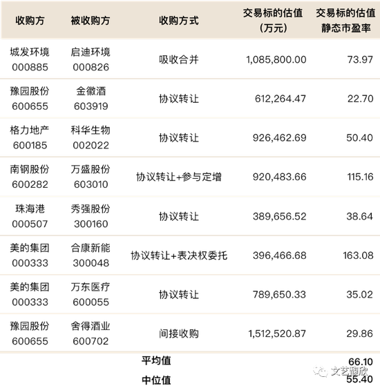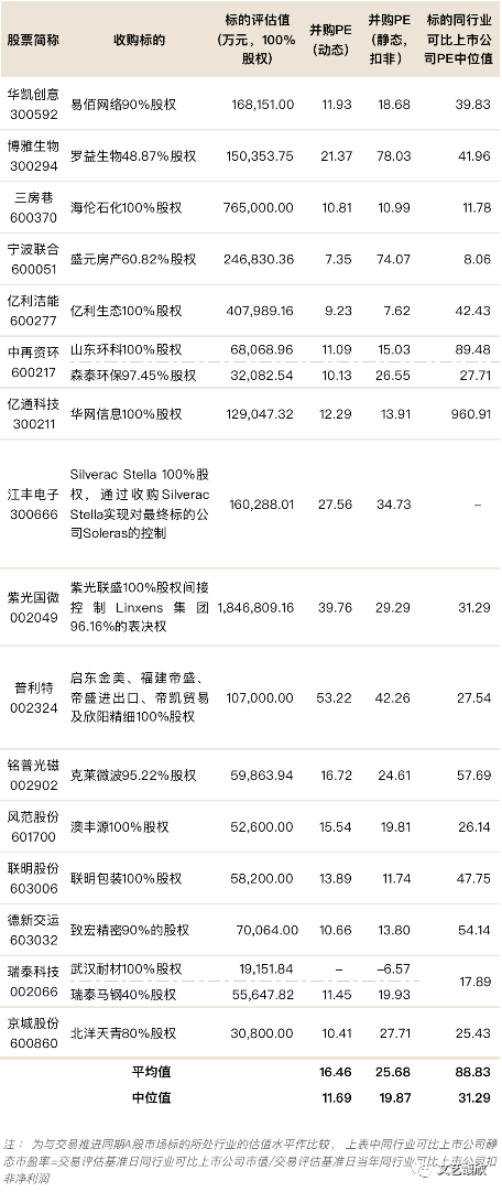 2020年以来,另一个有趣的现象是越来越多的上市公司成为收购标的,即所谓“A收A”,对于这些成为收购标的的上市公司来说,由于有二级市场的价格,自然也就不存在估值的天花板,我们再来看看这些“A收A”交易标的的上市公司估值。