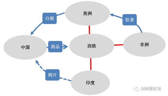 刚开始,明朝的白银主要来自日本等周边小国。西欧大航海之后,美洲(主要是墨西哥)的白银成为最主要来源。由于西欧控制了非洲、美洲和后来的印度,明朝的中国就被纳入到一个以西欧为中心的全球金融贸易网络:西欧国家将非洲的奴隶运到美洲开采金银矿,又将美洲的白银输出到中国,换取中国茶叶、丝绸、陶器等传统农业手工业产品;再往后的清朝时期,英国将印度统一为一个殖民地国家,印度的鸦片即变成换取中国商品的手段。