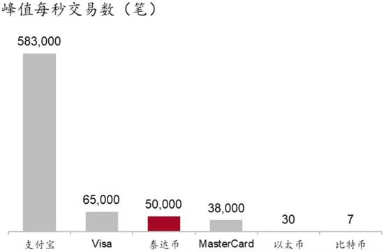 比特币作为虚拟的数字货币,受制于系统存储空间和安全确认的要求,限制了用来储存交易记录的区块大小和生成速度,因而根本上制约了比特币处理交易的速度。当前,比特币网络每天处理的交易笔数大约在30万笔上下,相比较其他电子支付系统(例如信用卡、微信支付和支付宝)的处理能力,无异于沧海一粟、九牛一毛(图3)。