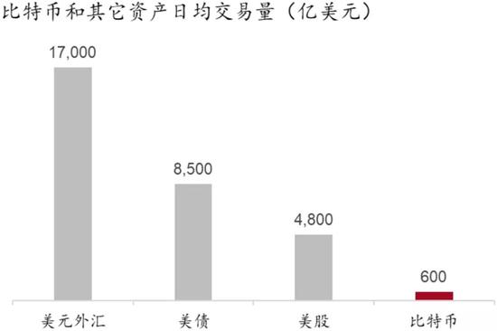 比特币被命名为“币”,是否真正具备货币的特征呢?十几年来的实践已经给出清晰的答案:非也。表面上,比特币似乎符合交易媒介的要求,否则马斯克不会在今年三月宣布考虑接受比特币付款。不过,比特币作为交易媒介,现实中遇到很多难以克服的难题,最主要的是流动性不足。我们知道,现金具有完全的流动性,可以随时用于支付;国债的流动性次之;股票再次(图2)。