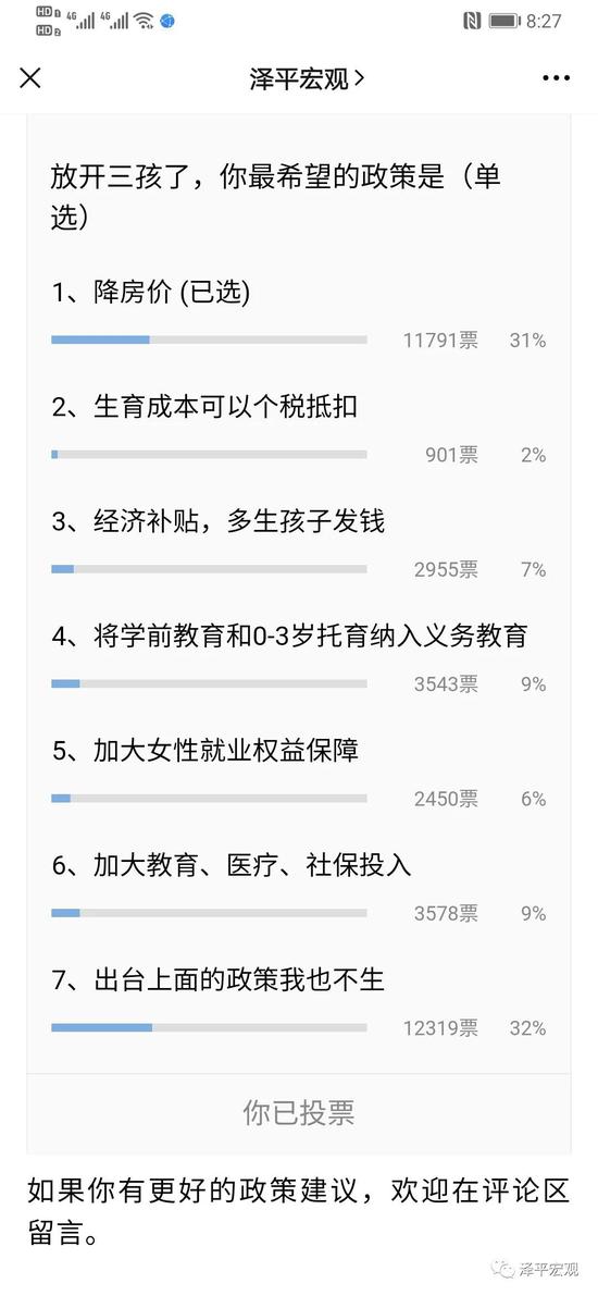 我们最近做了一个调研,放开三孩后你最希望的政策,大约有将近4万人投票;