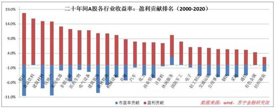 通过把年化收益率分解为盈利贡献和市盈率贡献,可以发现2000-2020年间,绝大多数行业的市盈率贡献都是负的,即过去二十年A股整体处于杀估值阶段(从69倍降至23倍),行业的盈利增长很大程度上被估值缩水对冲掉了。