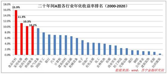我们先来回顾下历史表现。假定一个投资者自2000年末开始投资行业指数,持有至2020年末,结果会怎样呢?