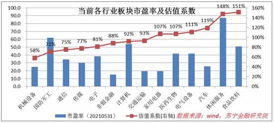 本文以2016年以来的行业平均市盈率为基准市盈率,取当前市盈率与基准市盈率的比值为估值系数,估值系数越高,代表行业估值水平越高。以食品饮料为例,当前市盈率(20210531)为51倍,基准市盈率为33.7倍,估值系数高达151%,从估值的角度看,并非好的买点。
