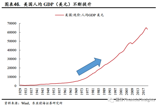 日本人均GDP在1995年冲顶,此后进入平台期。日本人均GDP在战后实现快速发展,日本人均GDP在1983年突破1万美元大关后,此后便快速提升,并在1995年达到4.3万美元。日本人均GDP快速提升,主要是其在科技方面对于领先国家的快速追赶以及日元升值叠加金融泡沫所带来的。之后由于金融泡沫破裂,日本人均GDP进入平台期,此后保持在3.5万美元左右。