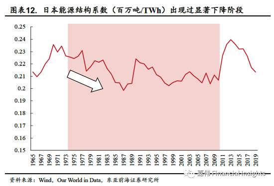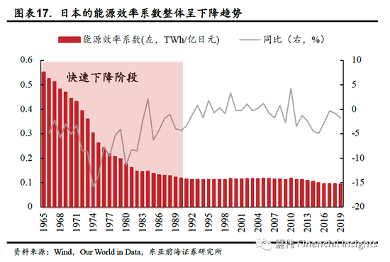 日本能源利用效率不断提升,90年代后基本保持稳定。日本能源效率系数整体呈下降趋势(代表能源利用效率上升),但下降趋势在1990年左右停止,从此进入了大致稳定阶段。