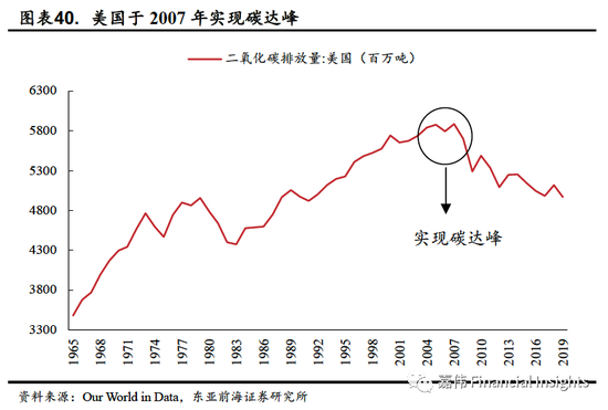 2007年美国实现碳达峰。1949年,美国能源消耗产生二氧化碳为22.07亿吨,直至1961年13年间,保持在30亿吨以下水平。从1962年后,美国能源消耗二氧化碳排放数量快速增长,1969年突破40亿吨,1988年增长到49.81亿吨,2006年增长到59.14亿吨。2007年,美国能源消耗排放的二氧化碳为60.03亿吨,美国实现碳达峰,此后碳排放开始下降。