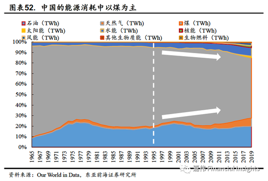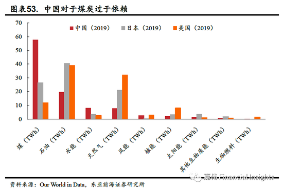 与发达国家相比国内对于煤炭依赖过大,且清洁能源占比较低。日本在其发展过程中,通过依赖核能、天然气方式实现了对于石油、煤等高污染能源替代;美国通过增加对天然气、太阳能、风能等能源使用实现对石油、煤油等传统能源依赖。目前虽然中国国内清洁能源使用比重在逐步加大,但是其所占比重远远小于发达国家。日本碳达峰时石油与煤炭消耗占比总和为71.15%(该时期由于福岛核电站事故,日本暂时减小了对于核能的依赖),煤炭消耗量占比为25.07%;美国碳达峰时石油与煤炭消耗量占比总和为63.99%,煤炭单独消耗量占比为23.51%;而2019年中国石油与煤炭消耗量占比总和为77.33%,且中国对于煤炭能源过于依赖,煤炭消耗量单独占比为57.04%,远高于其他经济体。根据发达国家经验,未来国内将降低对煤炭资源依赖,清洁能源所占比重将会快速提升。