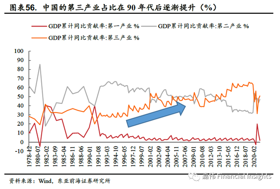 第三产业比重不断提升,但与发达国家相比占比仍然较低。自从20世纪90年代之后,国内第三产业对于GDP支撑作用就在逐步变大,在2021年3月,国内第三产业对GDP贡献率达到了50.9%,第三产业比重增加也使得国内经济发展对于资源需求降低,但是目前第三产业占比相较于发达国家(美国75%、日本68%)来说仍然偏低。