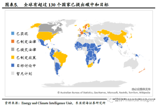 目前全球多个国际已积极提出实现碳中和计划,多数国家计划2050年实现碳中和。截至2021年5月,全球已经有超过130个国家提出碳中和目标,其中大部分计划在2050年实现碳中和,比如英国、法国、丹麦、加拿大、日本等国家;一些国家计划更早实现,比如乌拉圭提出2030年实现碳中和、芬兰目标为2035年、冰岛和奥地利目标为2040年,瑞典目标为2045年;且目前苏里南和不丹已经实现碳中和目标,进入了负排放时代。