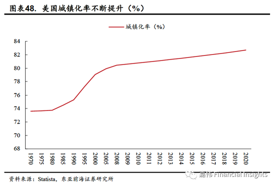 高城镇化率在一定程度上抵消了美国人口增长带来碳排放负担。这是由于城市化初期会增加二氧化碳排放,而持续城市化则会因规模效应和技术进步最终减少碳排放总量。美国2020年城镇化率已经达到82.7%,较高城镇化率也在一定程度上减少了美国由于人口增加带来碳排放负担。美国实现碳达峰主要依靠其对于清洁能源使用增加,其对能源市场政策改革也帮助其实现了单位GDP能耗的降低。