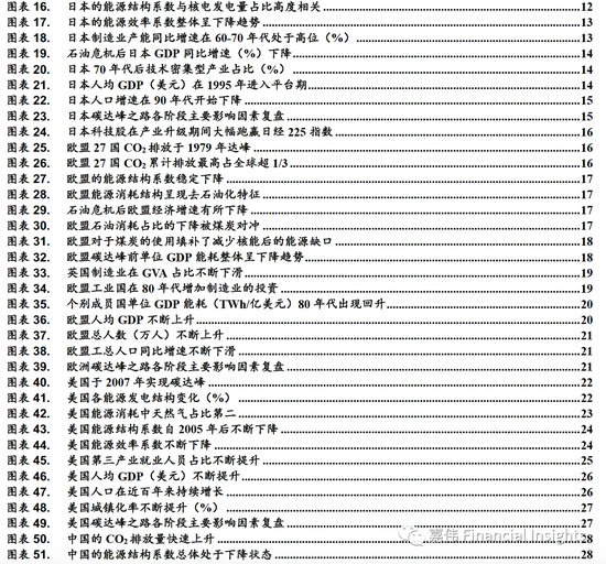 本文通过对CO2 排放量进行因子分解,将 CO2排放量分为能源结构系数、能源效率(单位GDP能耗)、人均GDP以及人口数量的乘积。日本以及欧洲碳达峰主要依赖清洁能源核能实现能源结构优化,辅之以产业升级以及产业转移从而实现其单位GDP能耗的下降;美国碳达峰主要依赖清洁能源天然气实现其能源结构优化,加之国家层面出台能源改革政策以实现其单位GDP能耗下降。人均GDP与人口数量对于碳排放的影响较为复杂,在考虑其量的同时还应该考虑到其结构的影响,我们认为人均GDP与碳排放存在倒U型影响路径,而人口数量对于碳排放影响需要考虑城镇化进程。