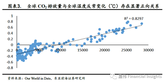 CO2排放量与全球温度变化存在显著正相关。全球CO2排放量在1951年进入加速期,随之在1976年全球温度上升也进入加速期,考虑到CO2从排放到引起气候变化需要时间,将1935年后全球CO2排放量与对应时间15年后的世界温度相对于1961-1990平均水平异常变化的中值做回归,回归后R2为0.83,且P值显著小于0.01,表明CO2排放量与全球温度变化存在显著正相关关系。