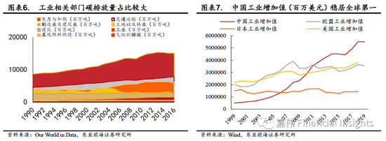 由于经济结构中制造业占比较大,中国目前是全球最大二氧化碳排放国。根据统计,当前全球CO2人为排放量中占比最大的为电力以及产热部门,其次为交通运输、建筑、制造业及建筑业等部门。排放量较多的部门多与工业相关度较高,而中国作为“世界工厂”,制造业较为发达,能耗占比较高,因此碳排放量在全球位居第一,这也导致未来中国碳减排之路挑战重重。