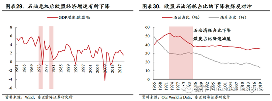 两次石油危机过后,欧盟对于石油依赖迅速减少,天然气补上了能源缺口。在两次石油危机之前,欧盟对于石油依赖程度相当大且一直上升,直到第一次石油危机前,欧盟能源消耗结构中石油占比为53.34%,石油成为欧盟主要能源。两次石油危机之后,欧盟经济与能源出现了巨大危机,期间欧盟经济同比增速出现了短暂大幅下降,1975年欧盟GDP同比增速由3.1%下滑至-0.65%,1981年欧盟的GDP同比增速由1980年2.07%下降至0.5%。在认识到石油对于经济巨大影响以及其不确定之后,欧盟便开始了其减少对于石油依赖程度。欧盟能源消耗中石油占比从1973年达到最高点53.34%,此后便开始了下滑阶段。但是虽然清洁能源在欧盟的能源消耗占比总体呈现上升状态,但是石油消耗减少带来缺口主要是被天然气、煤炭消耗所补上的。由于煤氢碳原子比在0.2-1.0之间,而石油氢碳原子比达1.6-2.0,因此在用煤替代石油能源过程中,往往会伴随着更多碳排放。