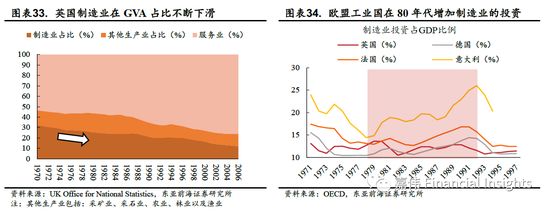制造业外移为欧盟降低了单位GDP能耗。欧盟由于工业化起步较早,且欧盟地区较早开始了工业转移。以英国为例,英国制造业在1970年占GVA(毛附加价值)比例为32%,在1979年其制造业占比已经下滑至26%。虽然在1982-1988年制造业占比下降速度大大减缓,但1988年之后制造业仍然保持了下降趋势。由于制造业创造单位GDP耗能更大,因此随着制造业占比减少,单位GDP能耗也开始减少。制造业转移同时欧盟自身也在进行产业升级,20世纪80年代后,欧洲传统工业大国制造业开始面临新挑战,一方面是亚洲新兴国家低廉的劳动力造成的成本优势;另一方面是以韩国、日本为代表一批新兴工业国家优良工业产品在全球份额越来越大,欧盟以德国为代表的制造业大国在成本和质量都不具优势情况下开始了产业升级。欧盟中主要工业国英国、德国、法国、意大利均在20世纪80年代前后增加了对于制造业投资,其制造业在向外转移同时开始实现自身升级。
