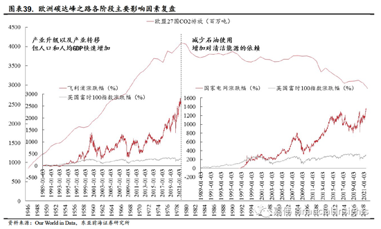 欧盟碳达峰之路主要依赖清洁能源增加,辅之以产业升级以及产业转移。在石油危机之前,欧盟虽然在进行产业升级以及产业转移,但是由于人口增加以及人均GDP增加,此阶段碳排放量仍处于上升状态,此阶段成立高科技公司在此后大幅跑赢市场(以英国富时100指数指代)。1980年之后欧盟迅速减少了对于石油依赖转而加大对清洁能源使用,其碳排放量也迅速减少,欧洲能源巨头也在此期间大幅跑赢市场。