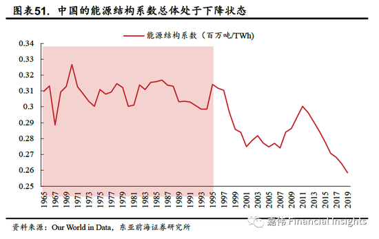 1995年以前中国能源消耗以煤为主,之后逐渐减少对煤依赖。1995年以前国内能源结构系数大致在0.31左右震荡,此阶段中国能源消耗以煤炭为主,且在1977年之后其消耗比例基本保持稳定。在1995年后,煤炭消耗量占比逐步减小,与之对应是对天然气与水能等清洁能源依赖加重,此阶段能源结构系数也逐步降低。