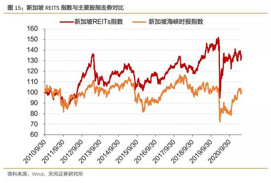 (4)从海外REITS市场表现来看,REITS收益表现好,美国、新加坡、香港REITS指数均长期跑赢大盘股指,但在市场波动较大的时候,REITS指数回撤同样较大,抗风险能力较弱。国内REITS与海外REITS市场既有相似性,但又要辩证看待。