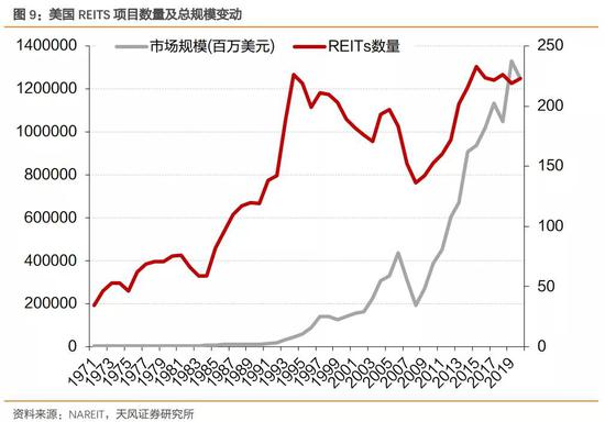 美国是全球规模最大的REIT市场,目前已经有223个REIT、合计规模达1.25万亿美元的REITS在美国上市。美国REITS分为权益型REITS和按揭REITS,目前以权益型REITS为主,市值达到1.18万亿美元;抵押型REITS仅41只,合计市值650亿美元。