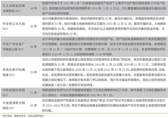 (3)受收费权期限和土地使用权期限影响,大部分底层资产的期限相比于基金存续期较短。这导致基金存续期将面临两个问题:一个是资产到期后续期成本不明,收费权类的基础资产续期成本可能较高;另外,评估中的现金流非永续,项目价值将逐渐归零,可能影响基金市场价格。